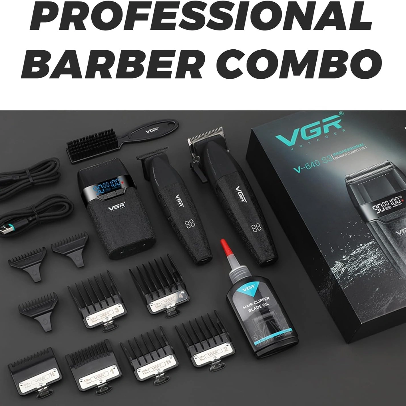 ALL-IN-ONE PROFESSIONAL GROOMING KIT:The VGR640S3 includes a powerful clipper, a precision trimmer, and a foil shaver—perfect for a complete grooming experience. Comes with 6 clipper guards (1.5–12mm), 3 trimmer guards (1–3mm), lubricating oil, cleaning brush, protective covers, and a charging cable. The clipper’s adjustable taper lever offers 5 trimming lengths, while the shaver ensures a smooth, clean finish. Ideal for barbers or at-home users seeking salon-quality results
