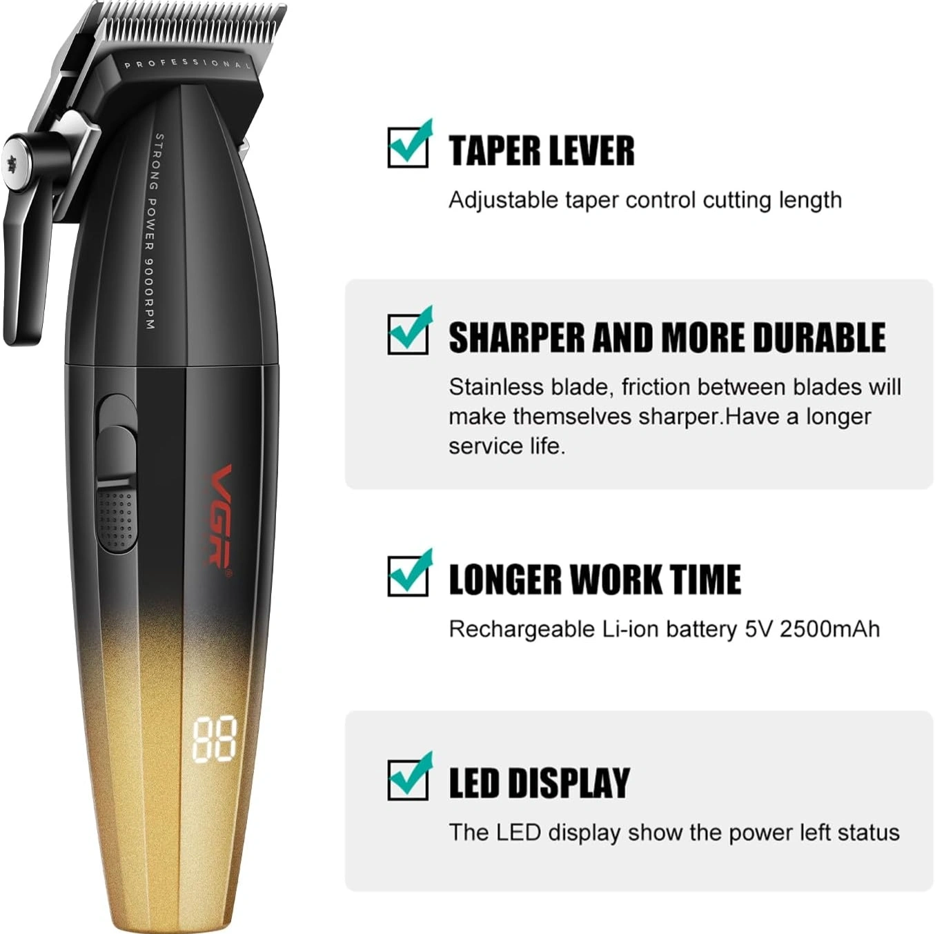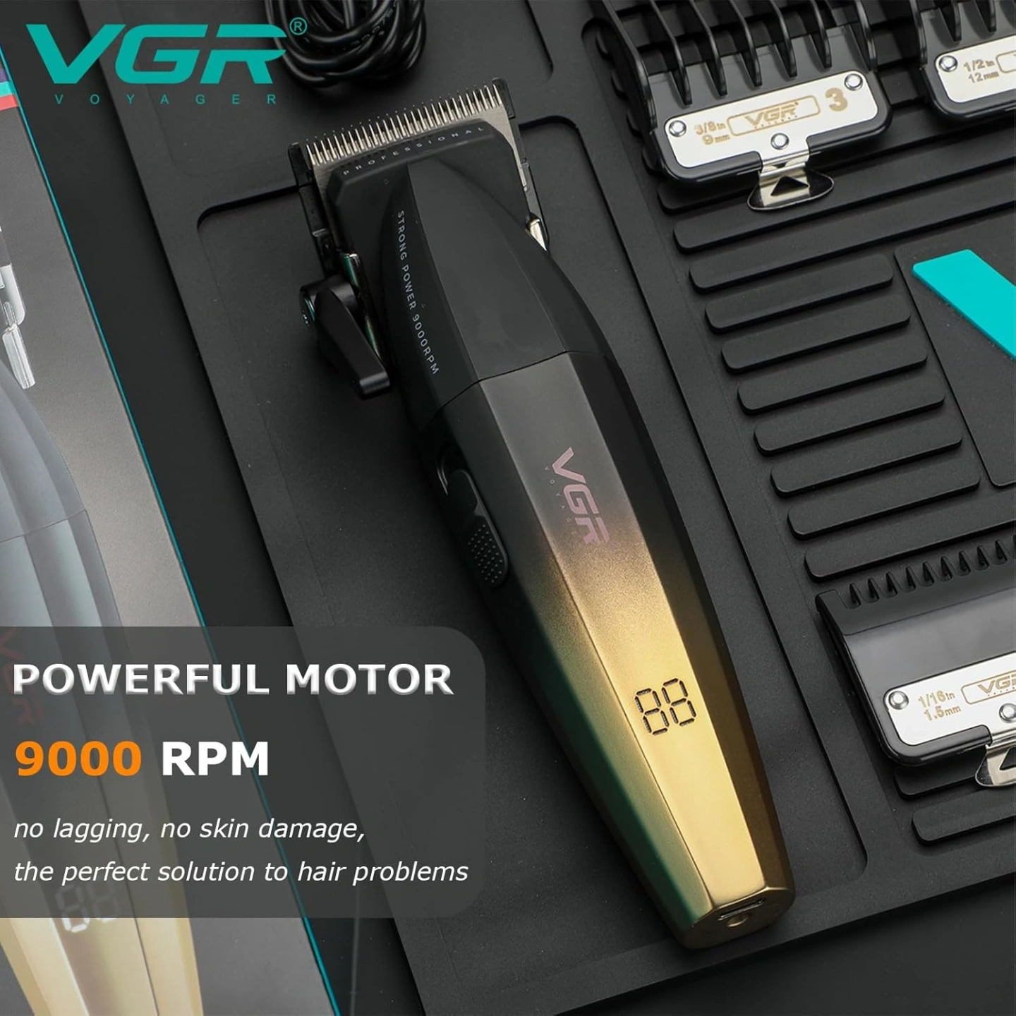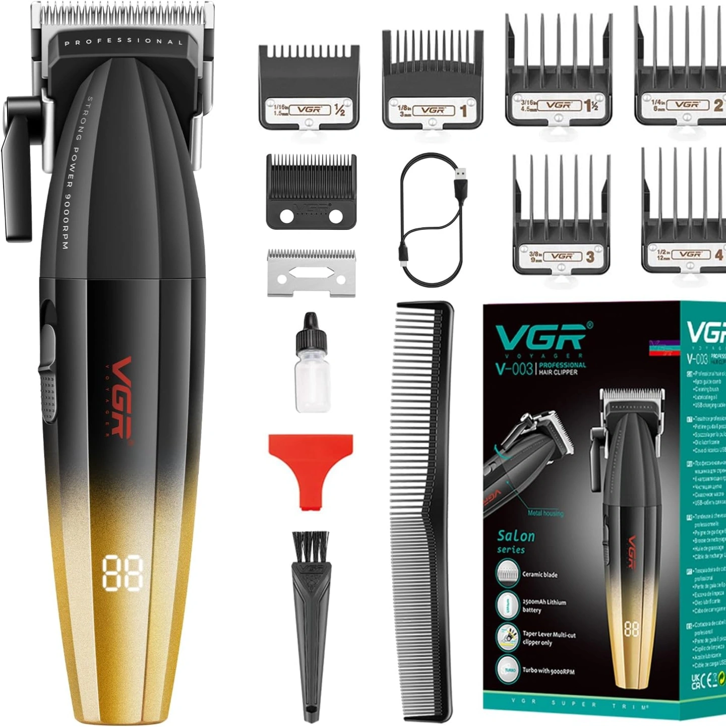 Introducing the VGR V-003 Professional Salon Series Hair Clipper, the ultimate grooming companion designed for men who demand precision, performance, and style. Engineered with cutting-edge technology and superior craftsmanship, this salon trimmer is a game-changer in the world of hair care. At the heart of the VGR V-003 is its advanced digital display, providing real-time feedback on battery life and speed settings. Equipped with ceramic and powder metallurgic blades, this clipper ensures unparalleled sharpness and durability, effortlessly gliding through the hair with precision and finesse. Featuring a powerful motor capable of reaching speeds up to 9000 RPM, the VGR V-003 guarantees swift and efficient cutting, while the Turbo Mode option provides an extra boost for tackling even the thickest hair with ease. Say goodbye to frequent recharging thanks to the long-lasting 2500mAh lithium battery, offering an impressive runtime of 250 minutes on a single charge. Versatility is key with the VGR V-003, as it comes with 6 guide combs ranging from 1.5mm to 12mm, allowing you to achieve a variety of cutting lengths and styles with precision and consistency. Whether you prefer a close shave or a stylish trim, this clipper has you covered. Backed by a 2-year warranty, you can trust in the quality and reliability of the VGR V-003 Professional Salon Series Hair Clipper. Elevate your grooming experience and unleash your style with VGR.