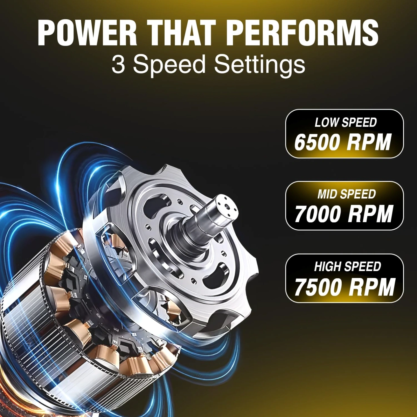 πππππ πππππ - Three adjustable speed settings (6500, 7000, 7500 RPM) offer powerful, efficient shaving for all hair types, ensuring a clean and quick grooming experience.