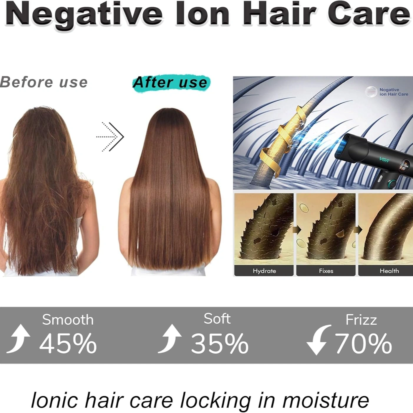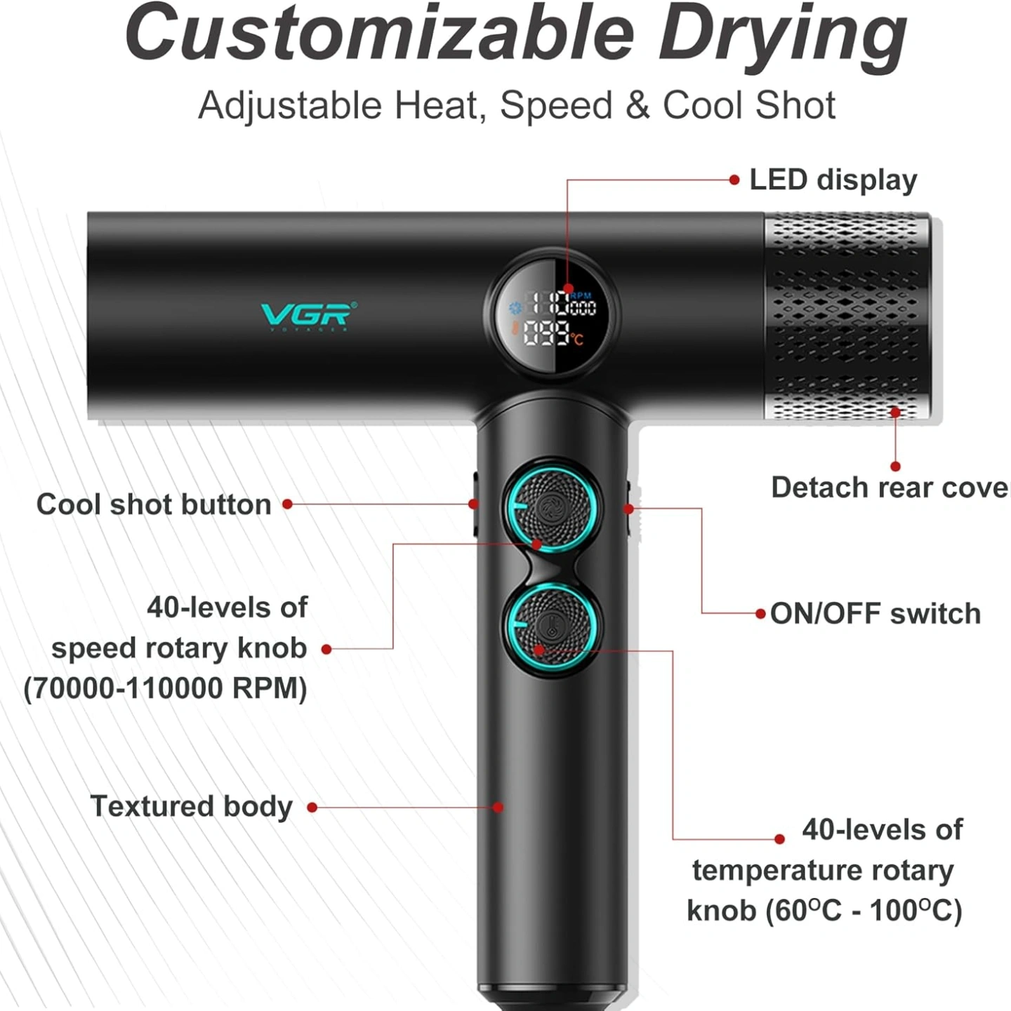The VGR V-401 Professional Hair Dryer is a powerful styling tool, perfect for salons and men’s use. With its innovative BLDC motor running at up to 110,000 RPM, it delivers rapid drying and superior styling. The 40-speed and 40-temperature settings let you customize your drying experience, ensuring optimal results every time. The Cool Shot feature locks in your style, while the intelligent LED display offers clear feedback. Designed for convenience, it includes a detachable rear cover for easy cleaning and maintenance. Whether you need to add volume, smooth your hair, or define curls, this dryer has you covered.